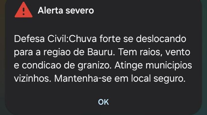 A Defesa Civil emitiu um alerta severo para chuva forte se deslocando para a região, acompanhada de raios, ventos e granizo. A orientação foi para que a população permanecesse em locais seguros.