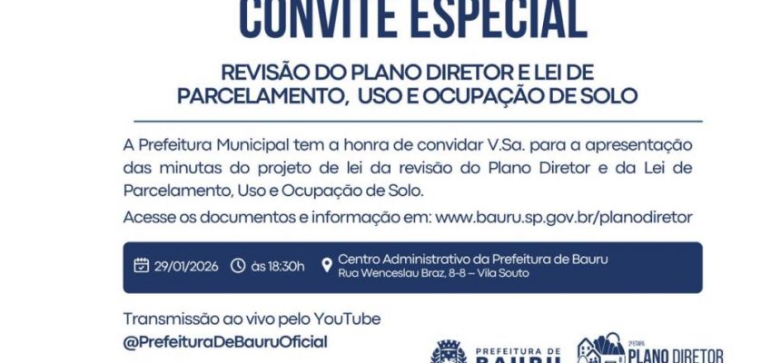 A Prefeitura de Bauru promove, nesta quinta-feira (29/01), uma audiência pública para apresentação dos projetos de lei finais da revisão do Plano Diretor e da nova Lei de Parcelamento, Uso e Ocupação de Solo.
